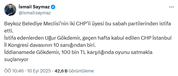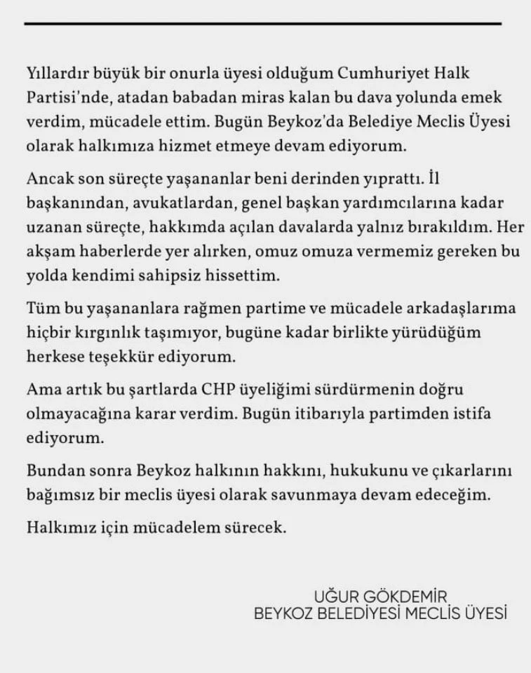 “Beykoz Belediye Meclisi’nin iki CHP’li üyesi bu sabah partilerinden istifa etti. İstifa edenlerden Uğur Gökdemir, geçen hafta kabul edilen CHP İstanbul İl Kongresi davasının 10 sanığından biri. İddianamede Gökdemir, 100 bin TL karşılığında oyunu satmakla suçlanıyor.”