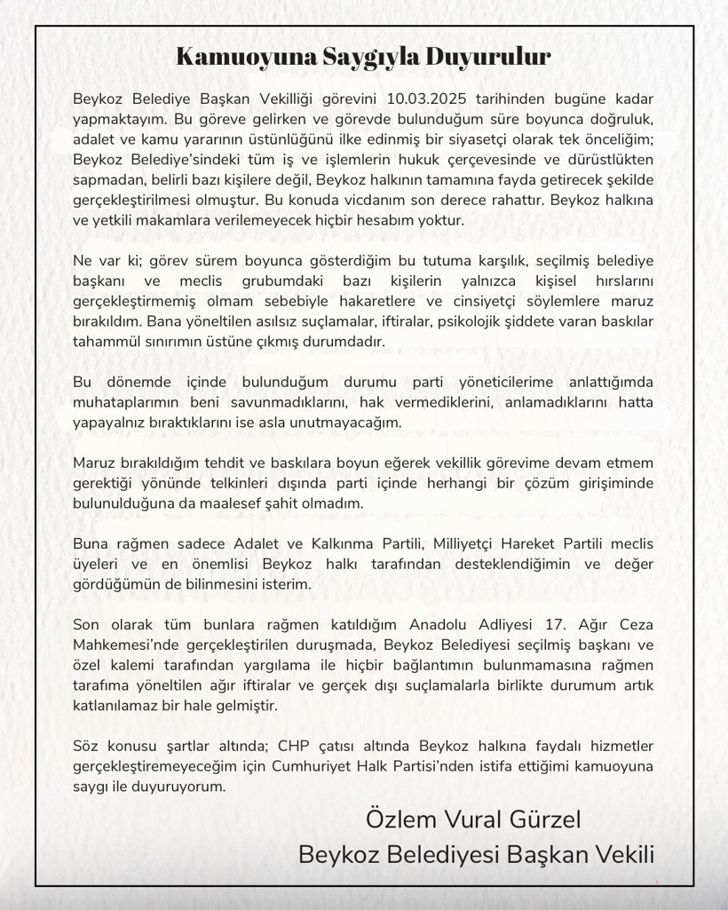 Görevden alınan Alaattin Köseler’in yerine belediye meclis üyesi Özlem Vural Gürzel seçilmişti. Köseler’in kısa süre önce tahliye edilip yeniden tutuklamasının ardından yeni bir gelişme yaşandı. Beykoz Belediyesi Başkan Vekilli Özlem Vural Gürzel, istifa ettiğini duyurdu. Sosyal medya hesabından bir paylaşım yapan Gürzel, tehdit ve baskıya maruz bırakıldığını, parti içinde bir çözüm sunulmadığını öne sürdü.