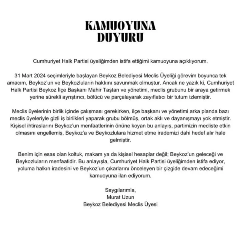 Murat Uzun “Yoluma halkın iradesini ve Beykoz’un çıkarlarını önceleyen bir çizgide devam edeceğimi kamuoyuna ilan ediyorum” diyerek partisinden istifa etme kararı aldığını duyurdu.