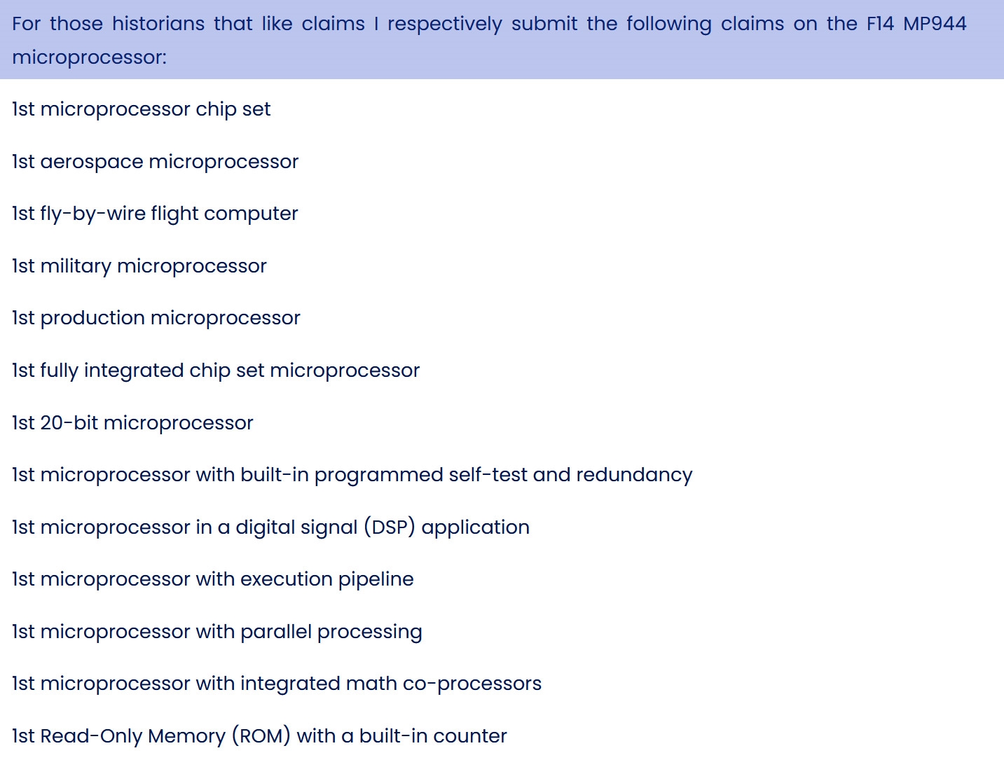 Bununla birlikte, hangi çipin gerçekten “ilk mikroişlemci” olduğu konusu halen tartışmalı. Bunun nedeni o dönemdeki işlemcilerin günümüz CPU’ları gibi tamamen bağımsız çalışmaması ve ek çiplere ihtiyaç duyması. Ayrıca 1970-71 döneminde tanıtılan Four-Phase Systems AL1 de bazı uzmanlar tarafından güçlü bir aday olarak gösteriliyor. Öte yandan MP944’ün araştırma makalesi Holt tarafından 1971’de yayınlanabilmiş olsaydı belki de şuan hepimiz farklı bir gelecekte yaşıyor olurduk.