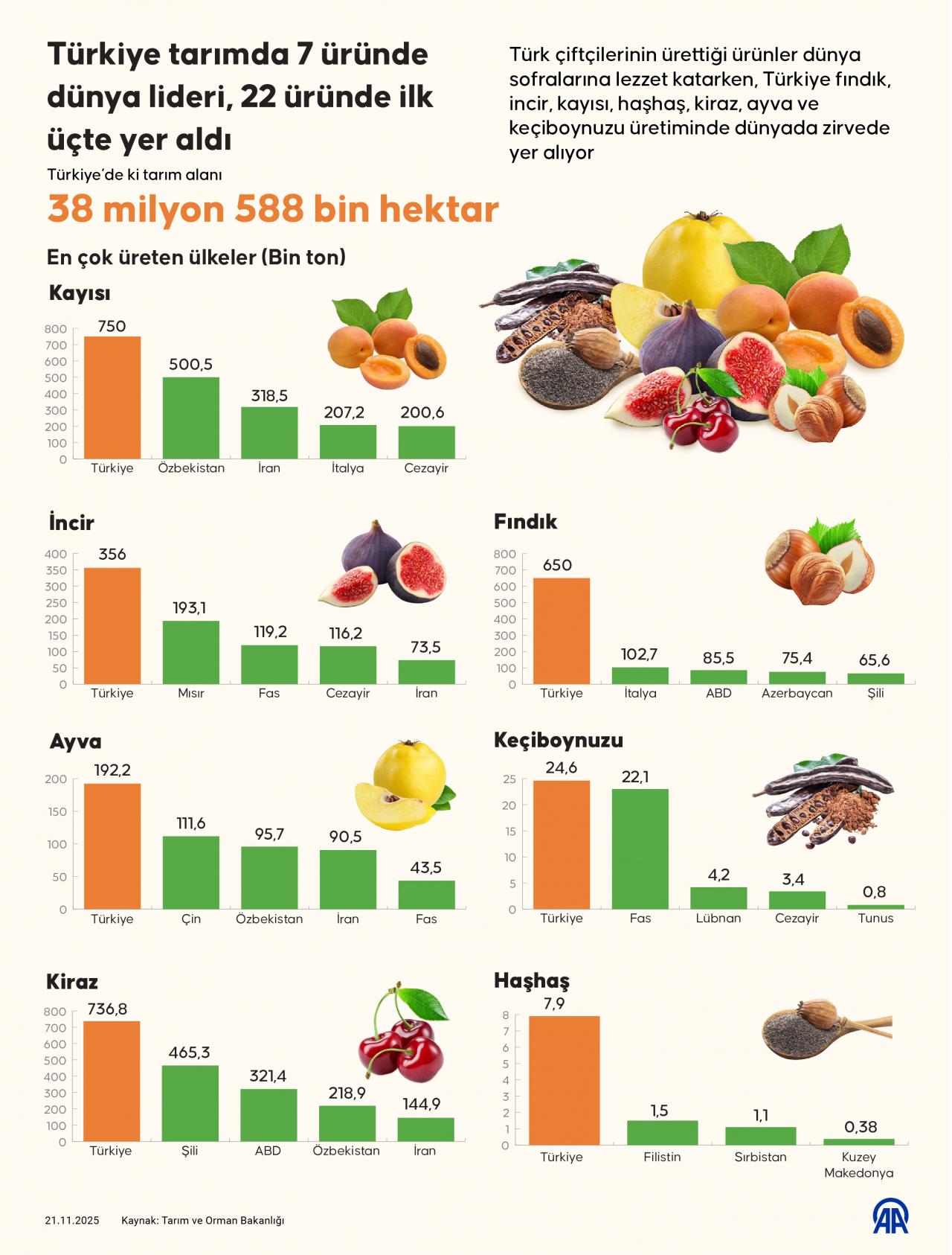 Tarım üretiminde dünyadaki konumuyla öne çıkan Türkiye’nin, ilk üçte 22 ürünü yer alıyor. Türkiye, fındık, incir, kayısı, haşhaş, kiraz, ayva ve keçiboynuzu yıllık üretiminde ise dünyada zirvede yer alıyor.